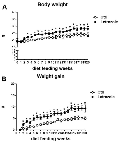 The body weight (A) and weight gain (B) of the letrozole-treated mice were significantly greater than in the control mice. The food intake showed no statistically significant difference between the two groups (C). Results are expressed as the mean ± SD. * p < 0.05, compared with the control mice.