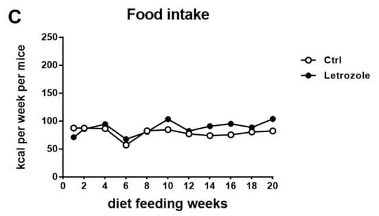 After 20 weeks of treatment, the letrozole-treated mice were significantly heavier than the control mice (p < 0.01) (Figure 4A). The body weight gain was also higher in the letrozole-treated mice compared with the control mice (p < 0.01) (Figure 4B). However, the food intake (kcal) did not show a statistically significant difference between the letrozole-treated mice and the control mice (Figure 4C).