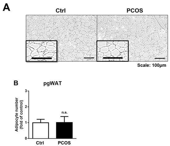 A histological image of the perigonadal white adipose tissue (pgWAT) is shown using H&E staining. Magnification = 400×. The virtual image of the adipose section (A) and the quantified result are both shown (B). Results are expressed as the mean ± SD. n.s.: not significant.