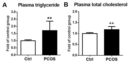 Plasma triglyceride and total cholesterol levels were significantly higher in the letrozole-treated mice compared with the control mice (p < 0.01) (Figure 6A,B).