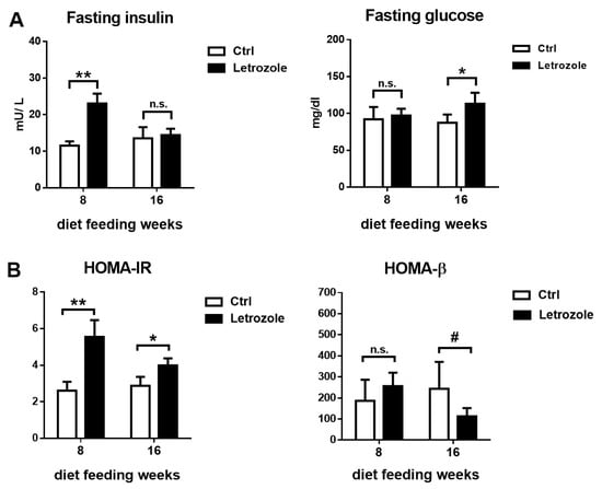 Comparing levels in fasting insulin, fasting glucose (A), HOMA-IR, and HOMA-β (B) levels from the letrozole-treated mice and the control groups at 8 and 16 weeks of oral feeding with letrozole. After 8 weeks of treatment with letrozole, the fasting plasma insulin levels were significantly higher in the letrozole-treated mice compared with the control mice. The HOMA-IR scores were significantly higher in the letrozole-treated mice after 8 and 16 weeks of treatment with letrozole. The results are expressed as the mean ± SD. # p < 0.1; * p < 0.05; ** p < 0.01, compared with the control mice. n.s.: not significant.