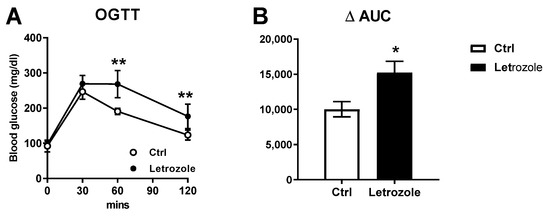 The oral glucose tolerance test (OGTT) was performed on the control and the letrozole-treated mice. The curves of plasma glucose (A) after glucose administration are shown. Using the AUC calculation, the letrozole-treated mice showed significantly higher levels than the control mice (B). The results are expressed as the mean ± SD. * p < 0.05; ** p < 0.01, compared with the control mice.