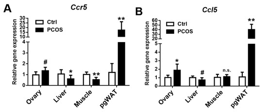 CCR5 (A) and CCL5 (B) expression in the ovary, liver, muscle, and perigonadal white adipose tissue (pgWAT) in the letrozole-treated and the control mice. The results are expressed as the mean ± SD. n.s.: not significant; # p < 0.1; * p < 0.05; ** p < 0.01, compared with the control mice.