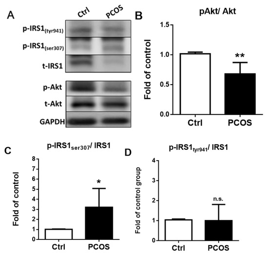 The insulin signal transduction pathway analysis of the perigonadal white adipose tissue (pgWAT) was performed in the letrozole-treated and control mice using Western blotting (A). Quantification analysis of relative Akt (B), IRS-1-Ser307 (C), and IRS-1-Tyr941 (D) phosphorylation in the pgWAT. Results are expressed as the mean ± SD. n.s.: not significant; * p < 0.05; ** p < 0.01, compared with the control mice.