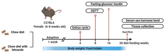 So far, there is no consensus on the best experimental animal model for the study of PCOS. According to [8], many methods have been used to induce a PCOS animal model, including exposure to androgen [9,10], estrogen [11], genetic modification, constant light [7], stress, and prenatal androgenization [12]. Androgen exposure is the most widely used method of inducing a PCOS animal model because the hyper-production of androgen in early life is thought to be the main cause of PCOS [10,13]. Excess androgen can also induce metabolic abnormalities, such as impaired glucose tolerance, and significant reproductive disturbances, including anovulation and ovarian cyst formation [13]. By injecting immature rats with a daily dose of DHEA (dehydroepiandrosterone), an animal model is created that exhibits an increased level of testosterone and is both anovulatory and acyclic, mimicking the typical features of hyperandrogenism in PCOS [9,13]. However, DHEA was reported to reduce body weight, serum glucose, and insulin and triglyceride levels in diet-induced obese male rats. This is contrary to the increased body mass index, hyperglycemia, and hyperinsulinemia seen in women with PCOS. Further, our previous study demonstrated that the DHEA treatment did not show insulin resistance in female rats even though the DHEA-treated rats had reproductive abnormalities that mimicked human PCOS symptoms. Therefore, we suggest that the DHEA-treated rats are not good animal models for studying metabolic abnormalities in PCOS [10]. Therefore, it is important to determine a better animal model for PCOS instead of the DHEA-treated rats.