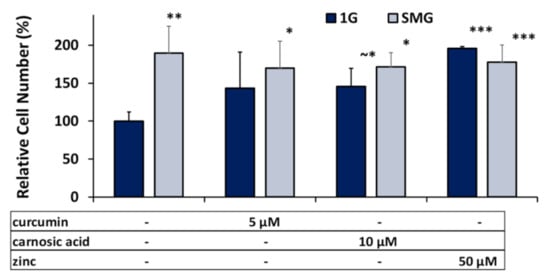 As seen in Figure 1, in the absence of nutraceuticals, the cell numbers in SMG increased by ~190% over the 1G controls. Furthermore, also in 1G, the addition of nutraceuticals led to an increase in the cell numbers by ~145% for the concentrations of the phytonutrients listed and an approximate doubling of cell numbers for zinc. In SMG, the nutraceuticals did not cause a significant increase cell numbers, in contrast to their effect in 1G.