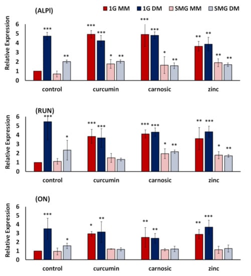 Effects of nutraceuticals on the expression of osteogenic marker genes ALPl, RUN, and ON. 7F2 cells were cultured for six days in 1G and SMG, respectively, in non-osteogenic maintenance media (MM) and osteogenic differentiation media (DM). Gene expression was analyzed by real-time PCR and normalized to the levels of a housekeeping gene (GAPDH), with 1G MM as control. The expression of each gene to internal control is presented as fold-change expression for each transcript, with control as 1-fold expression. For details, see Materials and Methods. Nutraceutical concentrations were 7.5 µM curcumin, 10 µM carnosic acid, 50 µM zinc. Values are Means +/− SD of n = 3. Versus 1G-MM-Control, Asterisk (*) p < 0.05, (**) p < 0.01, (***) p < 0.001. The results reflect means ± SD from three independent experiments (n = 3 biological replicates).