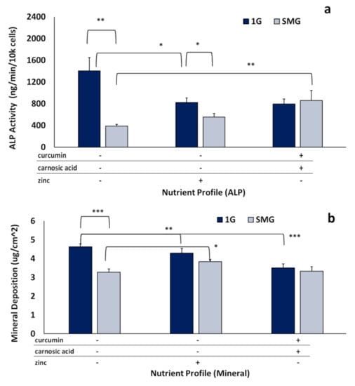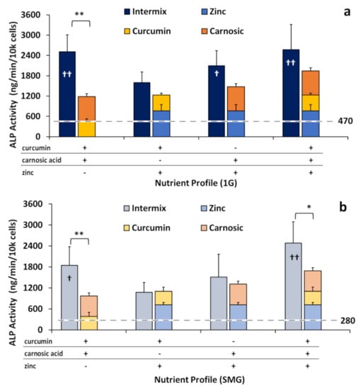 The intermix of curcumin and carnosic acid increased ALP activity approximately two-fold, 113 ± 37% in 1G and by 90 ± 33% in SMG, compared to the hypothetical additive of curcumin and carnosic acid individually. By contrast, when either phytonutrient was mixed with zinc (3.75 µM curcumin + 25 µM zinc or 12.5 µM carnosic acid + 25 µM zinc) additive effects were observed, where the total ALP activity was statistically not different from the (theoretical) sum of the individual nutraceuticals in both in 1G and SMG. The triple intermix of all three nutraceuticals also displayed a synergistic reaction, especially in SMG, due to the presence of the phytonutrients within the mixture.