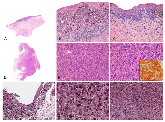 (A–C) Female, 76 years–Mucosal melanoma on the vulva (labia minora) characterized by atypical pigmented melanocytes in single units and nests with pagetoid spread; a brisk lymphocytic infiltrate with numerous melanophages is observed in the upper dermis; (D–F) Male, 86 years–Endoscopic biopsy reveals a bulky tumor diagnosed as amelanotic mucosal melanoma of the anal canal; the tumor shows diffuse proliferation of non-pigmented epithelioid cells; tumor cells show cytoplasmic and membranous CD117 staining (inset); (G–I) Female, 47 years–Highly pigmented conjunctival mucosal melanoma (left eye) with prominent melanin pigment in intracellular and extracellular location; both in situ (G) and invasive components (H,I) are shown. These images come from the pathology archive of patients with mucosal melanomas, as indicated in the “Materials and methods” section.