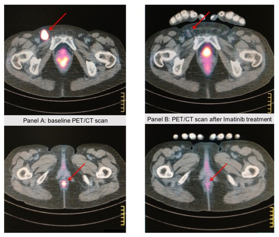 Certain KIT alterations, namely the KIT exon 11 and 13 mutations, show response to KIT inhibitors such as imatinib, nilotinib, and dasatinib [32,33]. Figure 2 shows PET/CT scan images of a patient with KIT exon 11 mutated anorectal mucosal melanoma responding to first-line treatment with imatinib. Conversely, KIT exon 17 mutation, KIT amplification, or immunohistochemistry staining positivity on tumor tissue appear to have minimal or no sensitivity to KIT inhibitors. A recent meta-analysis of 19 studies of c-Kit inhibitors for unresectable or metastatic mucosal, acral, or chronically sun-damaged melanoma (overall sample size of 601 patients) showed a pooled objective response rate (ORR) of 14% for all inhibitors among patients with mucosal melanoma, with the highest ORR (20%) for nilotinib [34]. Serial tumor biopsies of patients treated with nilotinib in a French phase II clinical trial showed that patients with good response to nilotinib had persistently decreased levels of phospho-STAT3 as compared with poor responders to treatment [35]. This data underlines the potential role of phospho-STAT3 as a biomarker of response to nilotinib through increased activity of KIT inhibition through the downregulation of the downstream signaling protein STAT3.