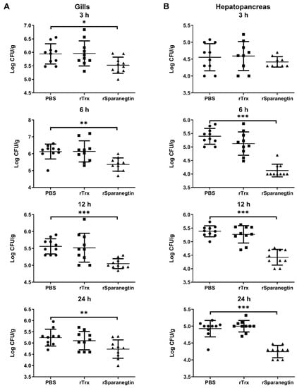 2.6.2. Pre-Incubation of rSparanegtin and V. alginolyticus Reduces Bacterial Load in the Tissues