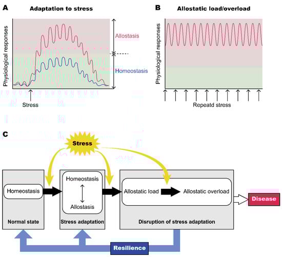 Allostasis and resilience. (A) Physiological responses to stressful stimuli in bodily systems including the autonomic nervous system, hormone responses, and inflammatory cytokines. Homeostasis refers to the body’s ability to maintain a stable internal milieu. Allostasis refers to the process that maintains homeostasis and to the drive of other physiological and behavioral systems by changing set points depending on changing environments. A normal allostatic response lasts for an appropriate time after stress, then returns to a normal level and ends [7]. (B) Allostatic load/overload is a state of chronically sustained allostasis that is induced by chronic stressful stimuli or inefficient management of allostasis. Allostatic load is also provoked by repeated normal responses over time, lack of adaptation, prolonged responses due to delayed shutdown and inadequate responses [7]. (C) Allostatic load or overload persistently activates physiological responses (neuroendocrine, cardiovascular and emotional responses) and accelerates the progression of various diseases. Resilience acts to restore physical and psychological conditions from a failed state of allostasis to a normal state.