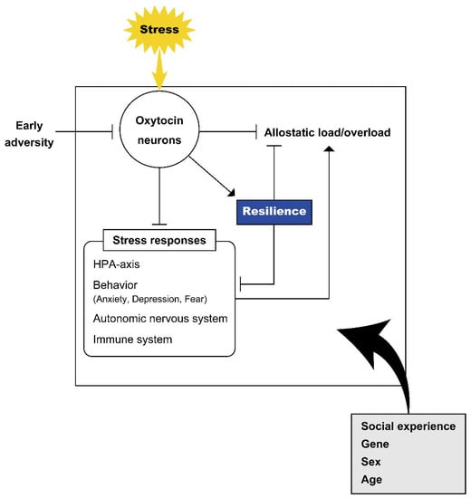 Stress is a state of threatened homeostasis in response to experiences that cause physical, emotional and psychological challenges that exceed the capacity of the individual to cope. Homeostasis is defined as maintenance of an internal environment that includes physiological variables such as heart rate, blood pressure, body temperature and blood sugar within a certain narrow range [1]. Homeostasis requires monitoring of these physiological parameters that are vital for life in order to keep values constant via feedback mechanisms. Owing to homeostasis, bodily systems are protected from being out of order due to harmful events [2]. However, various physiological parameters in fact show fluctuations depending on environmental challenges, and the concept of allostasis has recently become more prevalent. Allostasis was defined by Sterling and Eyer as “achieving stability through changes” [3]. Allostasis now refers to the regulation of internal milieu through gradual changes toward new set points. It is also thought that changes of set points by allostasis lead to other physiological and behavioral systems being driven to adapt to a changing environment. Bodily systems show adaptive processes in preparation for anticipated future changes in internal or external conditions. Shifts of set points dependent on conditions and activations of emergency systems are adaptive for a short period, while shifts and activations for a long period often cause overloads in various bodily systems, resulting in lifestyle-related disorders (Figure 1) [4,5]. It is important to restore the set points to their original place and to recover normal status before organs receive irreversible damage. Resilience refers to an individual’s capacity to make a successful recovery from psychological or physical difficulties. These difficulties include family problems, interpersonal relationships, health problems, workplace load and financial stressors. Resilience helps a person bounce back and recover from these difficult experiences [6]. In other words, resilience is the ability to restore a shifted set point and emergency system to their original setting after coping with difficulties and regain homeostasis (Figure 1). Molecular and neural mechanisms underlying allostasis and resilience still remain to be clarified. The present review focuses on the role of oxytocin in the control of stress responses, allostasis and resilience.