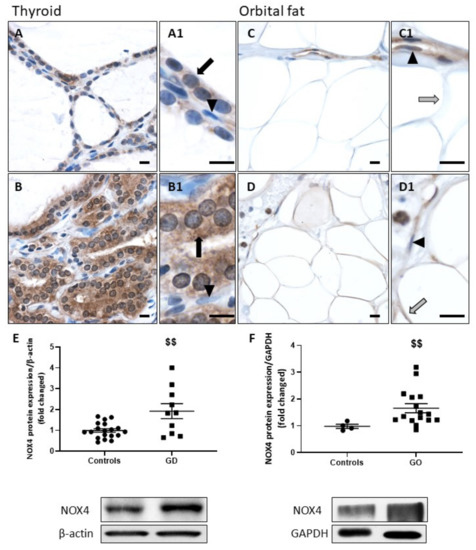Compared to control paranodular thyroid tissues of multinodular goiters (Figure 1A), the majority of the follicles from GD thyroids (Figure 1B) showed increased expression of NOX4 in thyrocyte’s cytoplasm. In adipocytes, cytoplasm staining for NOX4 was also pronounced in GO orbital fat (Figure 1D) versus the control (Figure 1C). Histological analyses were confirmed by WB, revealing a significant increase in NOX4 protein expression in GD thyroids and GO orbital fats compared to controls (Figure 1E,F). Of note, in both tissue types, endothelial cells only moderately expressed NOX4, regardless of the condition (Figure 1A1–D1).