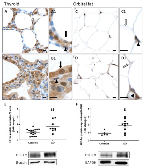 Increase of HIF-1α in GD thyroids and GO orbital fats. HIF-1α staining was higher in GD thyroids (B) than in controls (A). Similarly, GO orbital adipocytes presented a stronger expression of HIF-1α (D) compared to controls (C). Endothelial cells presented no difference in HIF-1α staining. (A1–D1) Thyrocytes are indicated by black arrows, adipocytes by gray arrows, and endothelial cells by arrowheads. Scale bars = 10 µm. Western blot analysis revealed that HIF-1α was significantly increased in GD (E) and GO patients (F). Data represent the mean ± SEM from 17 controls and 9 GD thyroids and from 4 controls and 10 GO orbital fats. $ p < 0.05 and $$ p < 0.01 compared to controls. Densitometric values were normalized against β-actin or GAPDH. Western blots shown are representative of both conditions.