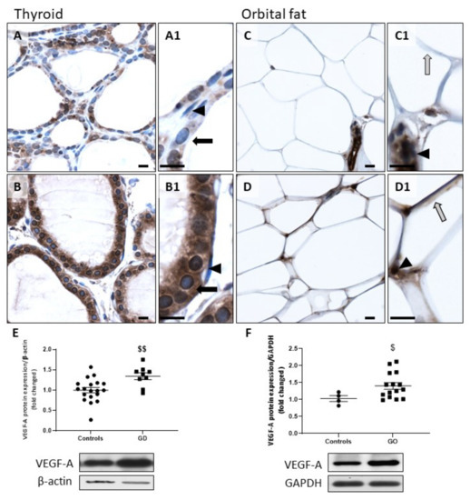 Increase of VEGF-A in GD thyroids and GO orbital fats. VEGF-A staining was predominant in GD thyrocytes (B) and GO orbital adipocytes (D) versus controls (A,C). Thyrocytes are indicated by black arrows, adipocytes by gray arrows, and endothelial cells by arrowheads (A1–D1). Scale bars = 10 µm. Western blot quantification of VEGF-A demonstrated an upregulation of this protein in GD (E) and GO (F) tissues. Data represent the mean ± SEM from 19 controls and 9 GD thyroids and from 4 controls and 15 GO orbital fats. $ p < 0.05 and $$ p < 0.01 compared to controls. Densitometric values were normalized against β-actin or GAPDH. Western blots shown are representative of both conditions.