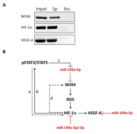 HIF-1α, NOX4 and VEGF-A have been proposed (based on in silico pairing, miRmap, Targetscan, pita, miranda) or have been identified as miR-199a direct targets in different tissues [31,32,33]. We then developed an assay to verify the existence of such regulation in GD. To do so, human primary thyrocytes were transfected with a biotinylated sequence of miR199-a-5p or scramble (bi-miR-199a-5p or with a bi-miR-scramble) and incubated for 48 h. Complexes of miR-199a-5p bound to targeted mRNAs were then collected using streptavidin coated beads. After RNA extraction, PCR amplification revealed that NOX4, HIF-1α and VEGF-A transcripts had indeed been precipitated in human thyrocytes transfected with bi-miR-199a-5p, similar to the input (Figure 4A). These three transcripts were not detected in thyrocytes transfected with bi-miR-scramble. Our results hence suggested that miR-199a-5p directly targets NOX4, HIF-1α and VEGF-A in human thyrocytes. By regulating NOX4, HIF-1α and VEGF-A, miR-199a could thus be considered a regulator of ROS production, OS and angiogenesis, as it has been proposed in other cell types [31,33,34,35,36] (Figure 4B).