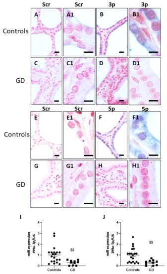 Expression of the miR-199a family was then investigated in control and GD thyroids. In situ hybridization showed intense (blue) specific cytoplasmic staining of miR-199-3p (Figure 5B) and miR-199-5p (Figure 5F) in control thyrocytes compared to the background colouringof the scramble probes (Figure 5A,E), showing that control thyrocytes highly expressed both miR-199-3p and -5p. In Graves’ thyroids (Figure 5D,H), the expression of miR-199-3p and -5p in the thyrocytes appears strongly reduced compared to controls (Figure 5D,H). miR199-3p and -5p were also detected in endothelial cells in both control and Graves’ thyroids, but their levels were not regulated by the pathology.