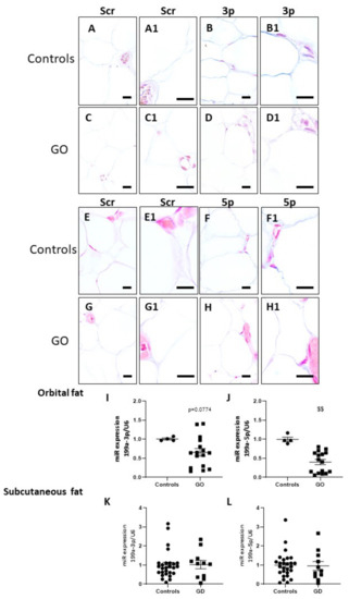 miR-199a family is downregulated in GO orbital adipocytes. In situ hybridization of LNATM probe Scramble-miR (A,C,E,G), of miR-199a-3p (B,D) and of miR-199a-5p expression (F,H) in controls and GO orbital fats. Note that control adipocytes expressed both miRs, whereas a very low signal was observed in GO orbital adipocytes (A1–H1). Scale bars = 10 µM. qRT-PCR confirmed a decreasing trend of miR-199a-3p and a significant reduction of miR-199a-5p in GO orbital fats (I,J). No modification of miR199a family profile expression was observed in GD subcutaneous adipose tissues compared to controls (K,L). The data were normalized with the data of U6 snRNA. Data represent the mean ± SEM for 4 controls and for 16 GO orbital fats and for 27 controls and 11 GD subcutaneous adipose tissues. $$ p < 0.01 compared to controls.