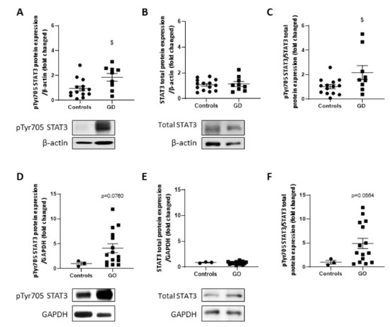 STAT3 is activated in GD thyroids and GO orbital fats. pTyr 705 STAT3 (A,D) and total STAT3 (B,E) were detected by Western blotting. Ratio of phosphorylated STAT3 to total STAT3 protein expression are represented in (C,F). A significant increase and an increasing trend of pTyr 705 STAT3 was observed in GD thyroids and GO orbital fats, respectively. Results are expressed as the mean ± SEM from 14 controls and 9 GD thyroids and 3 controls and from 15 GO orbital adipose tissues. $ p < 0.05 compared to controls. Densitometric values were normalized against β-actin for thyroid samples or GAPDH for adipose tissue. Western blots shown are representative of both conditions.