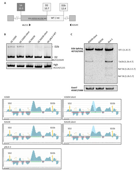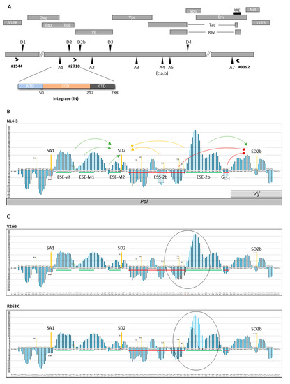 Here, we analyzed two antiviral drug-resistance-associated mutations, V260I and R263K, located within the C-terminal domain of integrase. The HIV integrase is encoded in the pol gene and promotes the integration of the provirus into the host’s genome. The splice sites SA1, SD2, and SD2b are located within this distal region of pol. Among others, the splicing regulatory elements ESE-Vif, ESS2b, and ESE2b modulate their usage [17,26,27].
