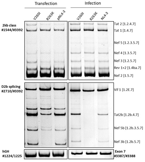 Using site-directed mutagenesis, the selected nucleotide exchanges were inserted into the pNL4-3 proviral plasmid coding for an HIV-1 laboratory wild-type strain. This permits the analysis and comparison of the splicing pattern after both transfection and infection. Different splicing patterns were amplified after transfection of HEK293T cells or infection of PM1 cells, which is a commonly used T-cell line in HIV-1 research [36]. Therefore, particular primer sets were used either amplifying transcripts of the 2 kb class or transcripts using splice donors D2 and D2b (#2710/#3632). For monitoring transfection efficiency, a plasmid coding for human growth hormone (hGH) was co-transfected and expressed transcripts amplified using primer pair #1224/#1225. To monitor the infection, a short region of HIV-1 exon 7 was amplified (#3387/#3388). Significant differences were only found in the analysis of the SD2/SD2b splicing pattern, both in comparison with the parental NL4-3 and between the mutants themselves. In the transfection experiments, the V260I variant showed a slight increase in the Tat2b message, which was in contrast to the HEXplorer prediction of a slight decrease in SD2b recognition. A similar pattern could be observed upon infection with the V260I virus (Figure 2). In the transfection experiment, the R263K mutant showed a reduced recognition of splice donor SD2b. This pattern was even more pronounced upon infection of PM1 cells with the R263K virus. Recognition of SD2b was completely abolished, which has a particular effect on the processing of Tat and Nef RNA species (Figure 2). This observation of the full loss of SD2b recognition upon the infection with the R263K virus was confirmed in three independent biological replicates.