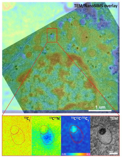 Nanoscale secondary ion mass spectrometry (NanoSIMS) imaging offers excellent lateral (down to 50 nm) and mass (>10,000) resolution, high sensitivity (ppm to ppb range) as well as information regarding the chemical composition of a sample [21]. In NanoSIMS, a sample surface is rastered by a primary ion beam, typically Cs+ or O−, in a pixel-by-pixel configuration. Sputtered secondary ions are then collected and transported to a mass spectrometer, where they are separated according to their mass to charge (m/z) ratios, and finally detected. Images are generated as color maps showing signal intensities across the scanned area for up to 7 selected secondary ions. This technique allows subcellular and nanometer-scale localization of atomic species such as non-native elements and isotopically tagged molecules [21]. The co-axial configuration of primary and secondary ion beams, which is the uniqueness of NanoSIMS, allows the use of lower beam currents. This improves spatial resolution while still preserving the high level of secondary ion collection, which boosts sensitivity.
