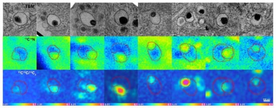 NanoSIMS images were dead time-corrected, drift-corrected and accumulated. TEM images were overlaid with the corresponding 12C14N− secondary ion images from NanoSIMS, which allowed us to determine the location of LDCVs in the NanoSIMS images. An example of this is shown in Figure 1. An additional overlay of hue-saturation-intensity (HSI) images of 13C12C−/12C2− secondary ion ratios reveals the localization of the 13C enrichment. The HSI model is a transformation of the red, green and blue (RGB) model. It codes the ratio value and statistics for the number of ions detected in each pixel, creating a color scheme which helps the human eyes to recognize ROIs more readily [28]. TEM images and corresponding NanoSIMS images are shown in Figure 2. As mentioned above, LDCVs are easily recognized in TEM images owning to their characteristic dense core structure. However, from a 12C14N NanoSIMS image alone, is it not possible to distinguish them from a variety of other cellular organelles and cytoplasmic features where the amount of 12C14N inherently differs. Here, by overlaying TEM and NanoSIMS images, it is possible to localize LDCVs in the secondary ion images. Owing to the high lateral resolution of the NanoSIMS, different vesicle compartments can be distinguished based on their distinct 12C14N content; namely, the dense core is present as a 12C14N rich domain due to the densely packed protein, while the halo appears to be 12C14N depleted. In total, eight vesicles displayed this pattern and these are shown in Figure 3.