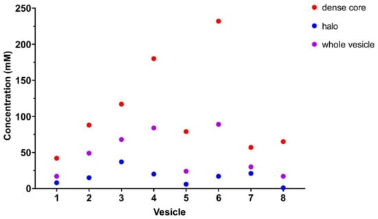 Concentration values for each ROI and vesicle are shown in Figure 4 and listed in Table S1. Concentrations for the dense core ROIs (red) are higher than those for the halo ROIs (blue), indicating that the enrichment of 13C dopamine is mostly localized in the dense core. This demonstrates that the 13C dopamine being synthesized during 4–6 h after 13C L-DOPA incubation is preferentially stored in the dense core, which is consistent with previous reports of compartmentalized storage of dopamine within LDCVs [22,30].
