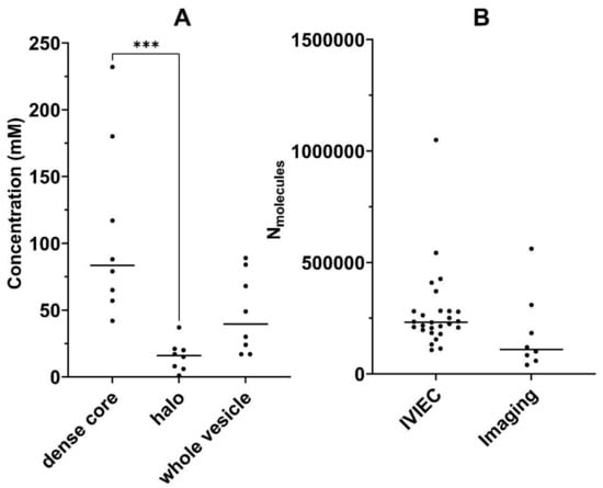 The number of molecules can be obtained by simply rearranging the equation for Nmolecules. Here, the number of molecules was calculated for each of the vesicles of interest using the concentration measured via NanoSIMS and the vesicle diameter measured via TEM. These values were compared with the average number of molecules per vesicle directly quantified by IVIEC in 27 live cells incubated with 150 µM L-DOPA for 5 h. The results are shown in Figure 5B and listed in Table S1.