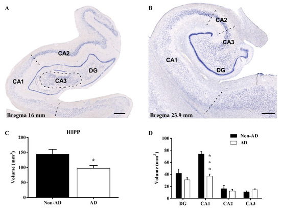Hippocampal volume reduction is specific to the CA1 subfield. Nissl staining of the AD HIPP at 16 mm (A) and 23.9 mm (B) from bregma, representing rostral to caudal levels, respectively, and identification of the hippocampal subfields (CA1-3 and the DG). The global HIPP volume (C) and volume of the CA1 subfield (D) were significantly reduced in AD (the graphs show the volume mean ± SEM, * p value < 0.05, *** p value < 0.001). Scale bar = 1000 µm.