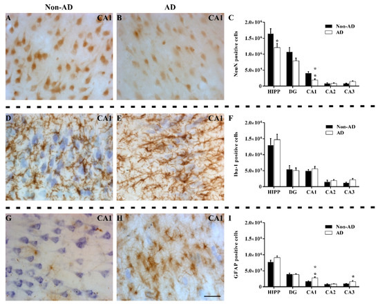 Alzheimer’s disease (AD) is the most prevalent neurodegenerative disorder [1] and is characterized by executive dysfunction and memory impairment [2,3]. Hippocampal volume loss and medial temporal atrophy on magnetic resonance imaging (MRI) have been proposed as early signals of neuronal injury and as diagnostic criteria for AD [4,5,6]. However, MRI studies concerning volume loss in different hippocampal subfields (cornu ammonis fields CA1, CA2, and CA3 and the dentate gyrus, DG) have shown contradictory results. This discrepancy might be explained by the intrinsic difficulty of MRI techniques in delimiting the boundaries of the hippocampal subfields [7,8]. Moreover, histological studies have revealed a global reduction in the hippocampal volume without distinguishing between hippocampal subfields [9,10] or a reduction in hippocampal volume restricted to the CA1 region [11]. On the other hand, postmortem studies using stereological approaches have shown preferential neural loss in the CA1 subfield [11,12,13,14], but neither neural nor glial-specific markers have been used.