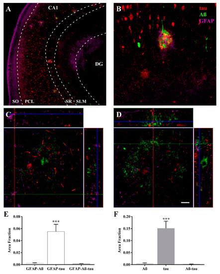 Astrocytes colocalize with tau and form clusters linked with plaques in the CA1 region. Immunofluorescence staining showed preferential distribution of tau in the PCL (red) and revealed that Aβ formed plaques in the PCL and SR layers (green) and that GFAP was found in all layers of the CA1 region (violet) (A). Clusters of astrocytes were dispersed around plaques (B). Z-stack reconstructions showed astroglial cell bodies (violet) around plaques (C) and astroglial processes (violet) were found in the vicinity of Aβ (green) in the plaque core (D). The graphs show the area fraction of GFAP-tau colocalization, GFAP-Aβ colocalization, and GFAP-Aβ-tau colocalization (E) and the area fraction of tau, Aβ, and both (F). (AD group (n = 5), the graphs show the mean ± SEM, *** p value < 0.001). (A,B) were obtained with a Zeiss Axio Imager M.2 microscope; (C,D) were obtained with a Zeiss LSM 800 confocal microscope. Scale bar = 250 µm in (A), 50 µm in (B), and 10 µm in (C,D).