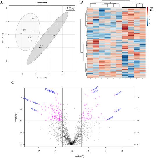 Prominent downregulated proteins in AD samples. Principal component analysis (PCA) revealed two-well defined groups of AD and non-AD samples (A). The cluster analysis data visualized by heatmap reveal the differential expression of 1635 proteins between groups (B). The volcano plot shows 47 up- and 102 downregulated proteins among a total of 1635 analyzed proteins (C) (FC > 1.5, p value < 0.01). Statistical analysis was performed with MetaboAnalyst 5.0.