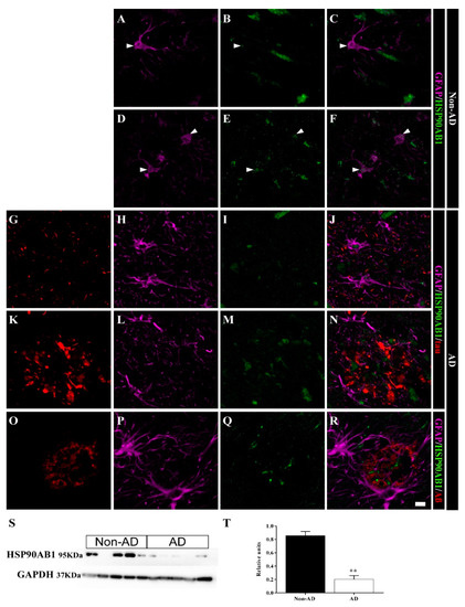 HSP90AB1 is colocalized with astrocytes in the human HIPP. Confocal analyses of GFAP (violet), HSP90AB1 (green) and tau or Aβ (red) expression in the CA1 region in non-AD (A–F) and AD (G–R) samples. In non-AD cases, HSP90AB1 was observed in astrocytes (arrowhead) (A–F). In AD samples, HSP90AB1 was found in plaque core, but was not expressed in astrocytes in the vicinity (N,R). However, isolated astrocytes showed a similar expression pattern between AD samples and non-AD samples (J). HSP90AB1 expression throughout the whole human HIPP was evaluated by WB (S,T) (the graph shows the mean ± SEM, ** p value < 0.01). Scale bar = 10 µm.
