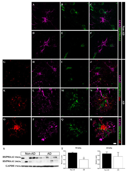 HSP90AA1 accumulates within plaques in the human HIPP. Confocal images of GFAP (violet), HSP90AA1 (green) and tau or Aβ (red) expression in the CA1 region in non-AD (A–F) and AD (G–R) samples. In AD cases, HSP90AA1 aggregated in plaques (N,R), and was in close contact with the Aβ plaque core (R). Astrocytes did not express HSP90AA1 in non-AD (A–F) or AD (K–O) samples. (S,T) HSP90AA1 expression throughout the whole human HIPP was evaluated by WB (the graph shows the mean ± SEM, * p value < 0.05). Scale bar = 10 µm.