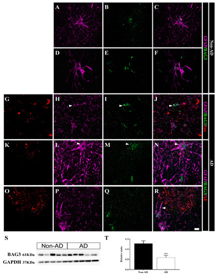 BAG3 is expressed in astrocytes in the human HIPP. Confocal analyses of GFAP (violet), BAG3 (green) and tau or Aβ (red) expression in the CA1 region in non-AD (A–F) and AD (G–R) samples. BAG3 was found in astrocytes in both non-AD samples (A–F) and overexpressed in AD samples (G–R). Some astrocytes showed mainly BAG3 staining instead of GFAP staining (H–J, arrowhead). BAG3 released within and around plaques was frequently observed (K–R). (S,T) BAG3 expression throughout the whole human HIPP was evaluated by WB (the graph shows the mean ± SEM, ** p value < 0.01). Scale bar = 10 µm.