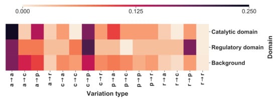 The heatmap reporting the frequency of each variation type as observed within the catalytic and the regulatory domains. The background distribution has been computed considering 22,763 pathogenic variations from Humsavar in 2513 proteins. In variation types, labels are as follows: a, apolar; c, charged; p, polar; and r, aromatic (for details see text). Differences between Catalytic and Regulatory sites are significant at 10% when a Chi-square test is applied after adding pseudocounts (with value 0.5) for regularization.