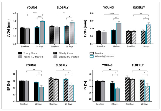 Echocardiographic parameters at baseline (black outlined bars) and after 28-day exposure to saline or isoproterenol infusion (blue outlined bars) in young and elderly mice. LVDd: End-diastolic left ventricular diameter; LVDs: End-systolic left ventricular diameter; IVS: interventricular septum thickness; PW: posterior wall thickness; EF: ejection fraction; FS: fractional shortening. N = 13 in both groups of young mice, and N = 14 in both groups of elderly mice. * p < 0.05, ** p < 0.01, *** p < 0.001, **** p < 0.0001.