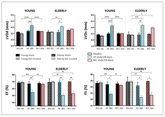 Echocardiographic parameters at baseline (black outlined bars), after 28-day exposure to saline or isoproterenol infusion (HF-28d, blue outlined bars) and at 56 days after exposure + recovery period (REC-56d, red outlined bars) in young and elderly mice. LVDd: End-diastolic left ventricular diameter; LVDs: End-systolic left ventricular diameter; IVS: interventricular septum thickness; PW: posterior wall thickness; EF: ejection fraction; FS: fractional shortening). N = 6/7 in sham/ISO-treated young mice; N = 3/4 in sham/ISO-treated elderly mice. * p < 0.05, ** p < 0.01, *** p < 0.001, **** p < 0.0001.