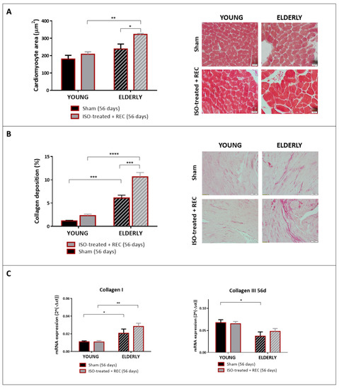 Histological findings and mRNA expression analyses at 56 days, after exposure to isoproterenol or saline infusion and recovery, in young and elderly mice. (A) Cardiomyocyte cross-sectional area (CSA) in the four study groups. A representative microphotograph for each one of them is shown (magnification ×40). N = 5/5 in sham/ISO-treated young mice; N = 3/4 in sham/ISO-treated elderly mice. (B) Quantification of collagen deposition in picrosirius-stained sections in the four study groups. Representative microphotographs are shown (magnification ×20). (C) mRNA expression of collagen I and collagen III in the four study groups. N = 6/7 in sham/ISO-treated young mice; N = 3/4 in sham/ISO-treated elderly mice. * p < 0.05, ** p < 0.01, *** p < 0.001, **** p < 0.0001.
