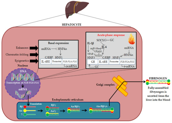 Fibrinogen biosynthesis in liver hepatocytes [9,10,11]. DNA—deoxyribonucleic acid; mRNA—Messenger ribonucleic acid; FGA-FGB-FGG—Fibrinogen chain genes; miRNA—Micro RNA; HNF4α—Hepatocyte Nuclear Factor 4 Alpha; HNF1—Hepatocyte nuclear factor 1; C/EBP—CCAAT enhancer binding proteins; IL-6RE—IL-6 response element; SOCS3—Suppressor of cytokine signaling 3; miR-18a—microRNA-18a; NFκB—Nuclear factor kappa-light-chain-enhancer of activated B cells; PIAS3—Protein inhibitor of activated STAT 3; STAT3—Signal transducer and activator of transcription 3; HNF3—Hepatocyte nuclear factor 3; IL-1β—Interleukin 1β, IL-6—Interleukin 6; GR—Glucocorticoid receptor; GC—Glucocorticosteroids; Bβ, Aα and γ—Fibrinogen polypeptide chains.