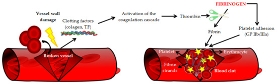 Many factors and/or conditions were shown to increase the plasma concentration of fibrinogen. These include: female gender, Black ethnicity, age, diabetes, smoking and alcohol consumption, arterial hypertension, obesity, lipid disorders, metabolic syndrome, menopause, oral contraceptives, microalbuminuria, lower socioeconomic status and premature family history of CVD. The association with body mass index (BMI) was twice as strong in women as in men. However, the association with smoking cigarettes was much stronger in men. Interestingly, plasma fibrinogen concentration is inversely related to serum HDL cholesterol (high-density lipoprotein cholesterol) concentration [17,18,19]. Interestingly, the renin-angiotensin-aldosterone system (RAAS) plays an important role in the regulation of fibrinogen plasma concentration. Therefore, as pointed out by Kryczka et al., differences in the regulation of RAAS in women (including the effect of estrogens) and in men may affect the fibrinogen plasma concentration and observed clinical effect [20]. The basic physiological function of fibrinogen is participation in the final stage of the clotting process and transformation into a fibrillar protein—fibrin, which forms a blood clot (Figure 2) [11].