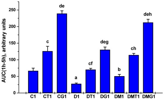 The AUC1h-5h values for the curves “testosterone concentration (nM) vs. time (hours)” in Table 3. and hCG. The AUC1h-5h values are given for the curves “testosterone concentration (nM) vs. time (hours)”, where 1h–5h represent the intervals from the first to fifth hours of treatment. The duration of MF treatment (120 mg/kg/day) was five weeks, and the single doses of TP3 and hCG were 15 mg/kg and 15 IU/rat, respectively. A single injection of LH/hCG-R-agonists was carried out on the 35th day of MF treatment (the final day of the experiment). a—the difference between the C1 vs. D1; b—the difference between the D1 vs. DM1; c—the difference between the C1 vs. CT1, D1 vs. DT1 and DM1 vs. DMT1; d—the difference between the C1 vs. CG1, D1 vs. DG1 and DM1 vs. DMG1; e—the difference between the CT1 vs. CG1, DT1 vs. DG1 and DMT1 vs. DMG1; f—the difference between the CT1 vs. DT1; g—the difference between the CG1 vs. DG1 or DMG1; and h—the difference between the DT1 vs. DMT1 and DG1 vs. DMG1 are significant at p < 0.05. The data are presented as the M ± SEM, n = 5.