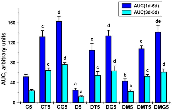 The AUC1d-5d and AUC3d-5d values for the curves “testosterone concentration (nM) vs. time (days)” in the control and diabetic animals, and the effects of five-week metformin treatment and five-day administration of TP3 and hCG. The AUC1d-5d and AUC3d-5d values are given for the curves “testosterone concentration (nM) vs. time (days)”, where 1–5 and 3–5 represent the intervals from the first to fifth days and from the third to fifth days of LH/hCG-R-agonists treatment, respectively. The duration of MF treatment (120 mg/kg/day) was five weeks, and the daily doses of TP3 and hCG were 15 mg/kg and 15 IU/rat, respectively. Five-day treatment with TP3 and hCG was carried out from the 31st to the 35th days of MF treatment. a—the difference between the C5 vs. D5; b—the difference between the D5 vs. DM5; c—the difference between the C5 vs. CT5, D5 vs. DT5 and DM5 vs. DMT5; d—the difference between the C5 vs. CG5, D5 vs. DG5 and DM5 vs. DMG5; and e—the difference between the DMT5 vs. DMG5 are significant at p < 0.05. The data are presented as the M ± SEM, n = 5.