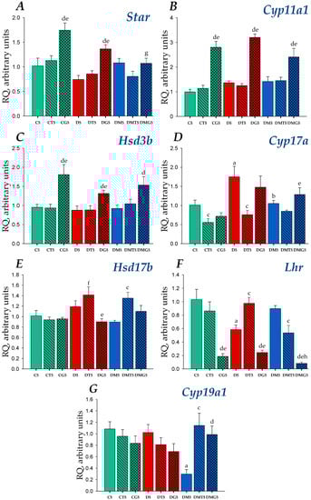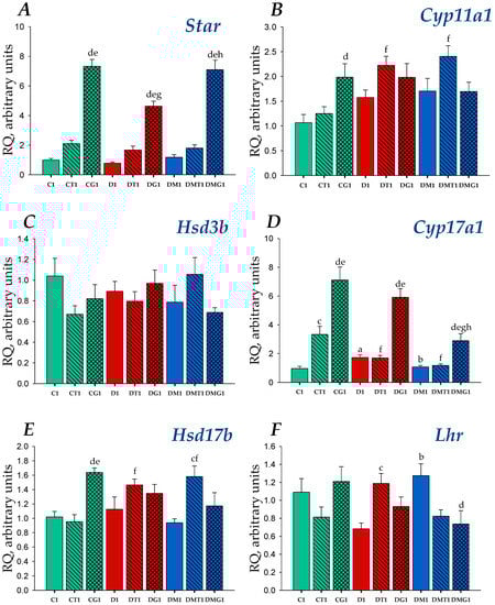 The influence of five-day treatment with hCG and TP3 on the expression of testicular genes encoding cholesterol-transporting protein StAR, steroidogenic enzymes and LH/hCG-R in the control and diabetic rats, and the effect of five-week metformin treatment. The duration of MF treatment (120 mg/kg/day) was five weeks. The samples for the assessment of gene expression in the testes were taken 5 h after the last injection of LH/hCG-R-agonists. The expression of the following genes is shown in the Figure: Star, encoding cholesterol-transporting protein StAR (A); Cyp11a1 (B), Hsd3b (C), Cyp17a1 (D) and Hsd17b (E), encoding four steroidogenic enzymes cytochrome P450scc, 3β-hydroxysteroid dehydrogenase, cytochrome P450 17A1/steroid 17α-monooxigenase and 17β-hydroxysteroid dehydrogenase that catalyze the synthesis of pregnenolone, progesterone, 17-hydroxyprogesterone, androstenedione and testosterone; LhR, encoding LH/hCG receptor (F); and Cyp19a1 (G), encoding aromatase that catalyzes the synthesis of estradiol. a—the difference between the C5 vs. D5 or DM5, b—the difference between the D5 vs. DM5; c—the difference between the C5 vs. CT5, D5 vs. DT5 and DM5 vs. DMT5; d—the difference between the C5 vs. CG5, D5 vs. DG5 and DM5 vs. DMG5; e—the difference between the CT5 vs. CG5, DT5 vs. DG5 and DMT5 vs. DMG5; f—the difference between the CT5 vs. DT5; g—the difference between the CG5 vs. DMG5; and h—the difference between the DG5 vs. DMG5 are significant at p < 0.05. The data are presented as the M ± SEM, n = 5.