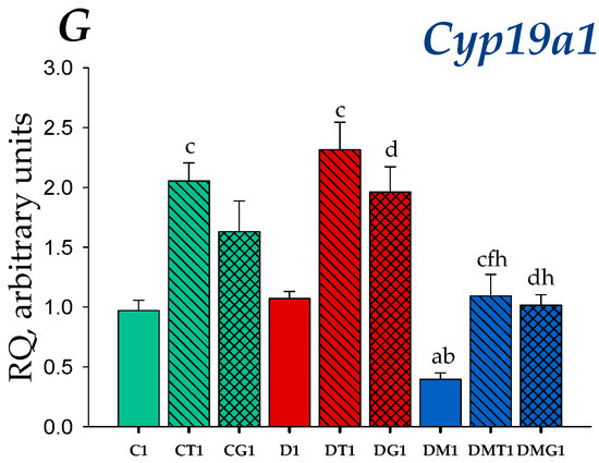 The influence of a single treatment with hCG and TP3 on the expression of testicular genes encoding cholesterol-transporting protein StAR, steroidogenic enzymes and LH/hCG-R in the control and diabetic rats, and the effect of five-week metformin treatment. The duration of MF treatment (120 mg/kg/day) was five weeks. The samples for the assessment of gene expression in the testes were taken 5 h after the injection of LH/hCG-R-agonists. The expression of the following genes is shown in the Figure: Star, encoding cholesterol-transporting protein StAR (A); Cyp11a1 (B), Hsd3b (C), Cyp17a1 (D) and Hsd17b (E), encoding four steroidogenic enzymes cytochrome P450scc, 3β-hydroxysteroid dehydrogenase, cytochrome P450 17A1/steroid 17α-monooxigenase and 17β-hydroxysteroid dehydrogenase that catalyze the synthesis of pregnenolone, progesterone, 17-hydroxyprogesterone, androstenedione and testosterone; LhR, encoding LH/hCG receptor (F); and Cyp19a1 (G), encoding aromatase that catalyzes the synthesis of estradiol. a—the difference between the C1 vs. D1 or DM1, b—the difference between the D1 vs. DM1; c—the difference between the C1 vs. CT1, D1 vs. DT1 and DM1 vs. DMT1; d—the difference between the C1 vs. CG1, D1 vs. DG1 and DM1 vs. DMG1; e—the difference between the CT1 vs. CG1, DT1 vs. DG1 and DMT1 vs. DMG1; f—the difference between the CT1 vs. DT1 or DMT1; g—the difference between the CG1 vs. DG1 or DMG1; and h—the difference between the DT1 vs. DMT1 and DG1 vs. DMG1 are significant at p < 0.05. The data are presented as the M ± SEM, n = 5.