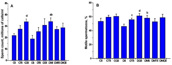 In diabetic rats, both hCG and TP3 increased the proportion of motile spermatozoa and progressively motile spermatozoa, and hCG was more effective than TP3 (Figure 5). The sperm count tended to increase, but the differences from the control were not significant (Figure 5). In the MF-treated groups, the stimulating effects of TP3 and hCG on sperm motility were not detected (Figure 5). Furthermore, unlike the DM5 group, the total sperm count in the DMT5 and DMG5 groups did not differ significantly from the C5 and D5 groups (Figure 5). All these data indicate that the five-day administration of hCG and TP3 to MF-treated diabetic rats was not able to improve the restorative effect on spermatogenesis, which was achieved with the use of MF monotherapy.