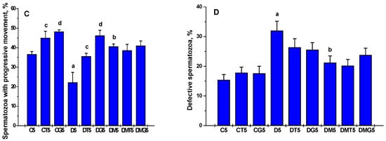 The effects of five-week metformin treatment, five-day treatment with LH/hCG-R-agonists and their combination on the sperm count (A), proportion of motile sperm (B), proportion of sperm with progressive movement (C), and proportion of sperm with tail and head morphological defects (D) in the control and diabetic rats. a—the difference between the C5 vs. D5 or DM5, b—the difference between the D5 vs. DM5; c—the difference between the C5 vs. CT5 and D5 vs. DT5; and d—the difference between the C5 vs. CG5 and D5 vs. DG5 are significant at p < 0.05. The data are presented as the M ± SEM, n = 5.