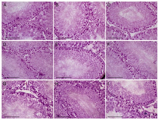 The histochemical analysis of the seminiferous tubules in the testes of control and diabetic rats, and the effect of long-term metformin treatment and five-day treatment with LH/hCG-R-agonists. (A)—C5, (B)—CT5, (C)—CG5, (D)—D5, (E)—DT5, (F)—DG5, (G)—DM5, (H)—DMT5, (I)—DMG5. The histology of the rat testes was evaluated using the staining of the testis section with Mahler’s hematoxylin. Scale bars, 100 µm.